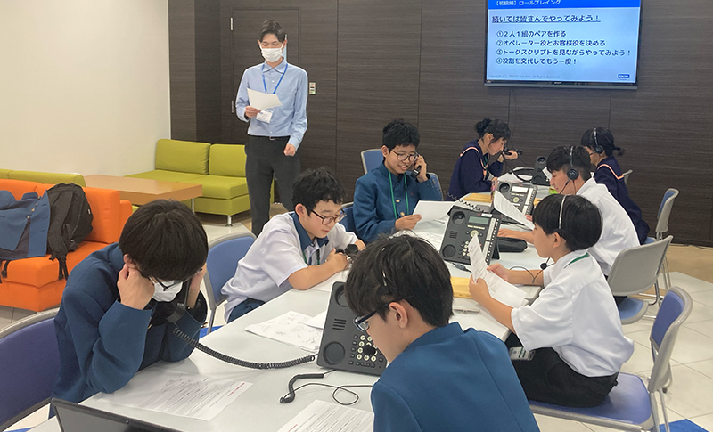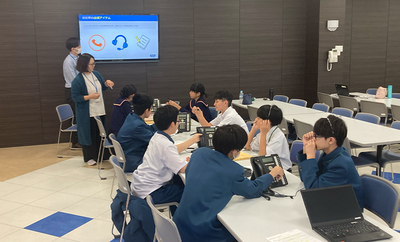 続いて、ヘッドセットを着用し『仕事をする』上で必要な【敬語】を、実際に口に出して会話を体験しました。